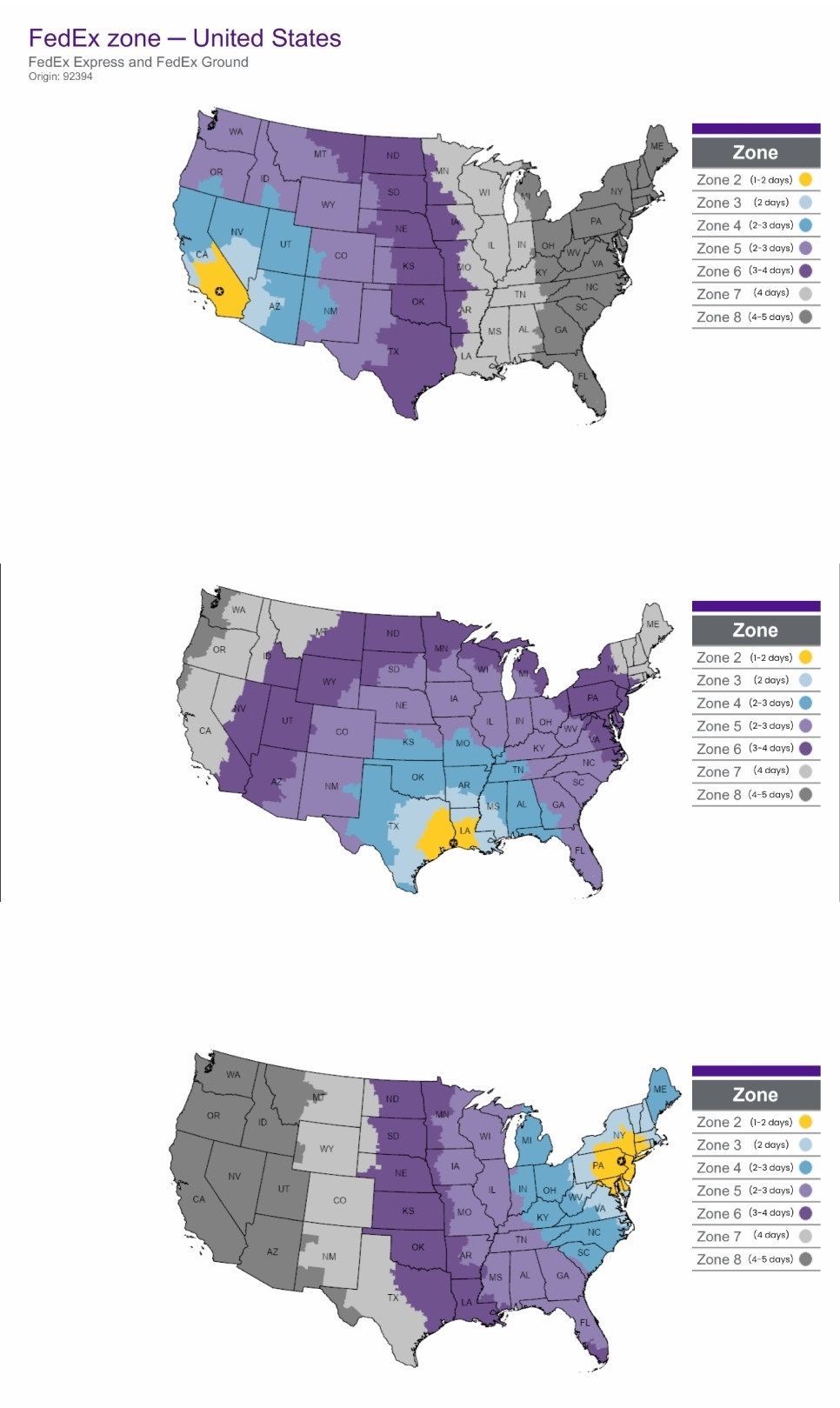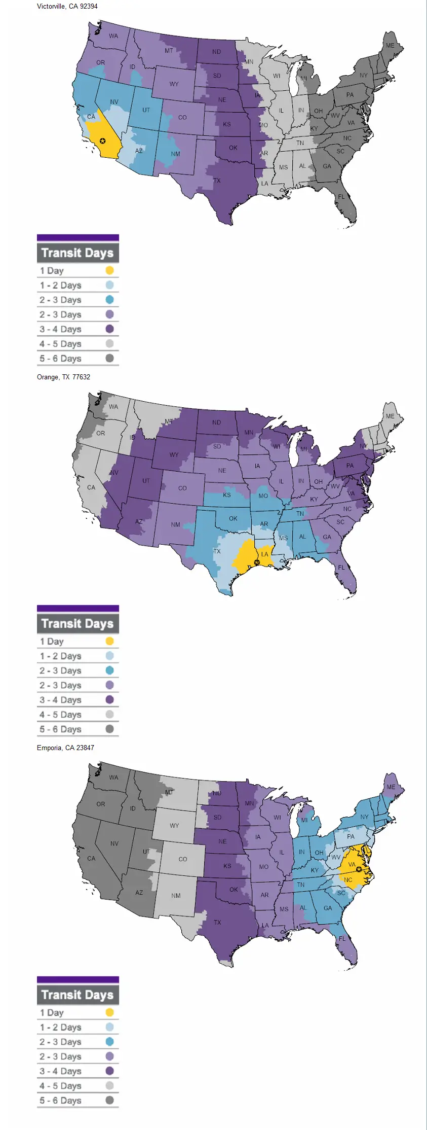 The maps below show the average number of business days for delivery via ground. Orders must be placed by 5:00pm EST to qualify for next day processing. All delivery times do NOT include 1 to 2 business days needed for order processing.
